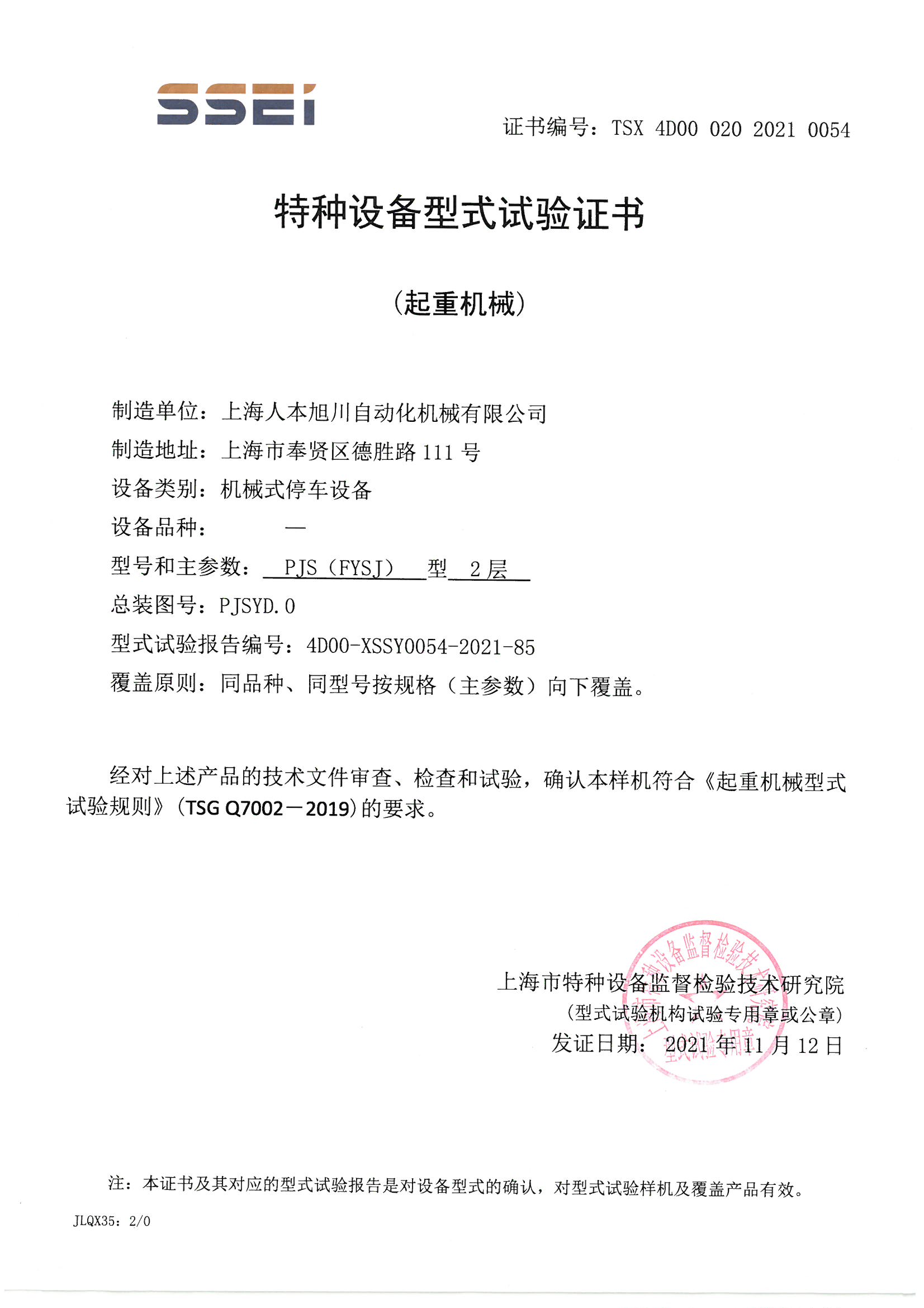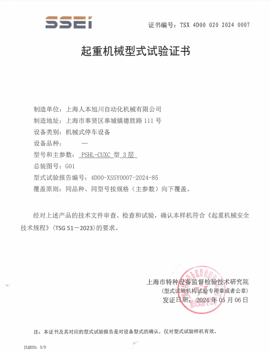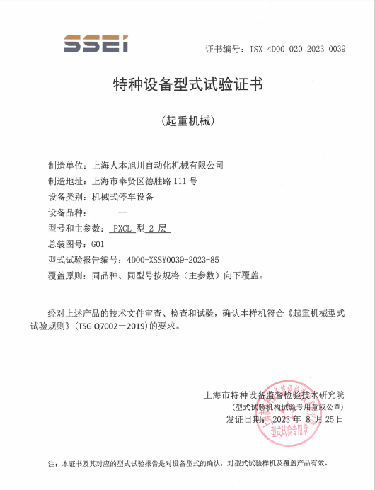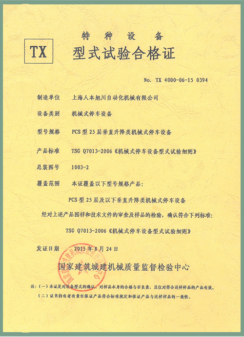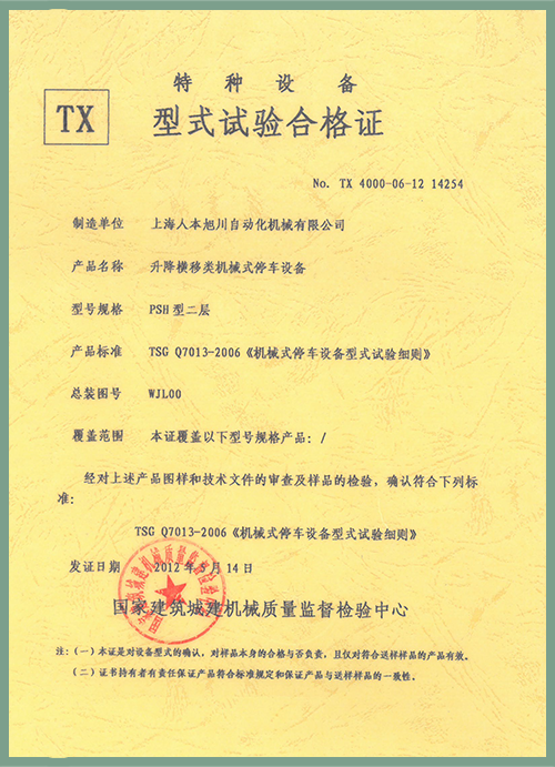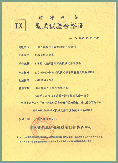 PJS(FYSJ)型2層型式試驗(yàn)證書