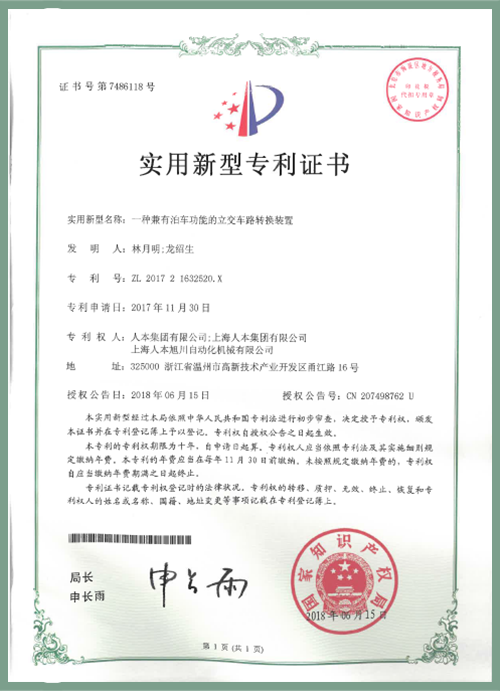 一種兼有泊車功能的立交車路轉(zhuǎn)換裝置-專利證書