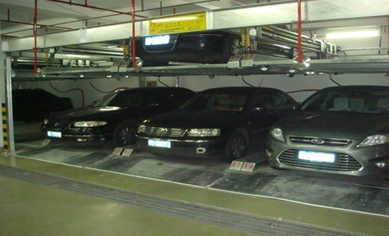工作原理:每個車位均有載車板,所需存取車輛的載車板通過上升、下降、橫移等運動過程到達地面層,駕駛員進入車庫,存取車輛,完成存取過程。停泊在此類車庫內(nèi)地面層的車只作橫移,不必升降,上層車位或地坑下層車位需通過中間層橫移出空位,將載車板升或降到地面層,駕駛員才可以進入車庫內(nèi)將汽車開進或開出車庫。