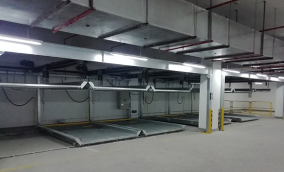 工作原理:每個(gè)車(chē)位均有載車(chē)板,所需存取車(chē)輛的載車(chē)板通過(guò)上升、下降、橫移等運(yùn)動(dòng)過(guò)程到達(dá)地面層,駕駛員進(jìn)入車(chē)庫(kù),存取車(chē)輛,完成存取過(guò)程。停泊在此類車(chē)庫(kù)內(nèi)地面層的車(chē)只作橫移,不必升降,上層車(chē)位或地坑下層車(chē)位需通過(guò)中間層橫移出空位,將載車(chē)板升或降到地面層,駕駛員才可以進(jìn)入車(chē)庫(kù)內(nèi)將汽車(chē)開(kāi)進(jìn)或開(kāi)出車(chē)庫(kù)。