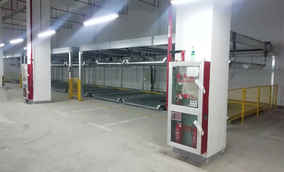 工作原理:每個(gè)車位均有載車板,所需存取車輛的載車板通過上升、下降、橫移等運(yùn)動(dòng)過程到達(dá)地面層,駕駛員進(jìn)入車庫,存取車輛,完成存取過程。停泊在此類車庫內(nèi)地面層的車只作橫移,不必升降,上層車位或地坑下層車位需通過中間層橫移出空位,將載車板升或降到地面層,駕駛員才可以進(jìn)入車庫內(nèi)將汽車開進(jìn)或開出車庫。