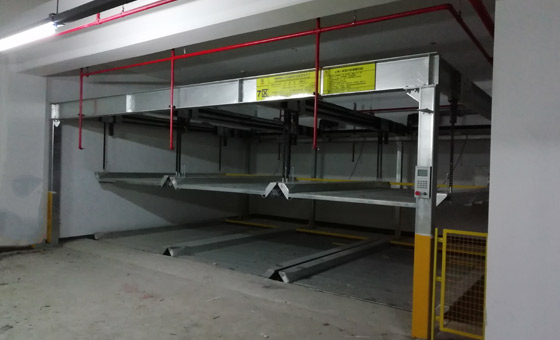 工作原理:每個車位均有載車板,所需存取車輛的載車板通過上升、下降、橫移等運動過程到達(dá)地面層,駕駛員進(jìn)入車庫,存取車輛,完成存取過程。停泊在此類車庫內(nèi)地面層的車只作橫移,不必升降,上層車位或地坑下層車位需通過中間層橫移出空位,將載車板升或降到地面層,駕駛員才可以進(jìn)入車庫內(nèi)將汽車開進(jìn)或開出車庫。